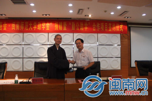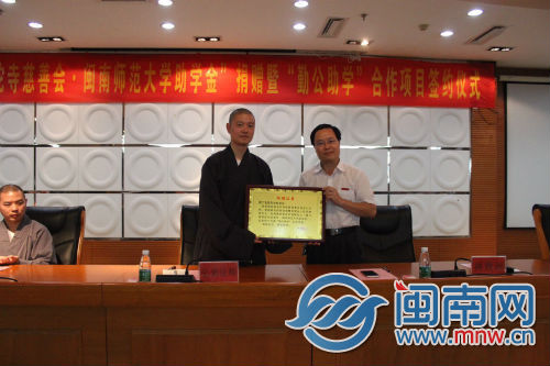 此次活动中,厦门南普陀寺慈善会为闽南师大200名家庭经济困难学生设立了每年100万元慈善助学金。林致远处长代表学校与南普陀寺慈善会签订了捐赠协议,并向捐赠单位颁发捐赠荣誉证书。