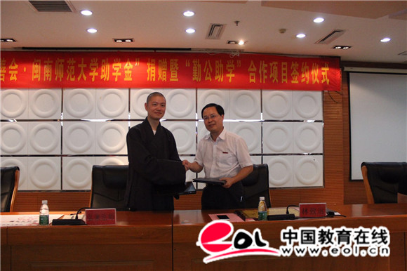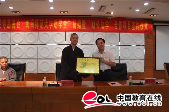 此次活动中,厦门南普陀寺慈善会为闽南师大200名家庭经济困难学生设立了每年100万元慈善助学金。林致远处长代表学校与南普陀寺慈善会签订了捐赠协议,并向捐赠单位颁发捐赠荣誉证书。