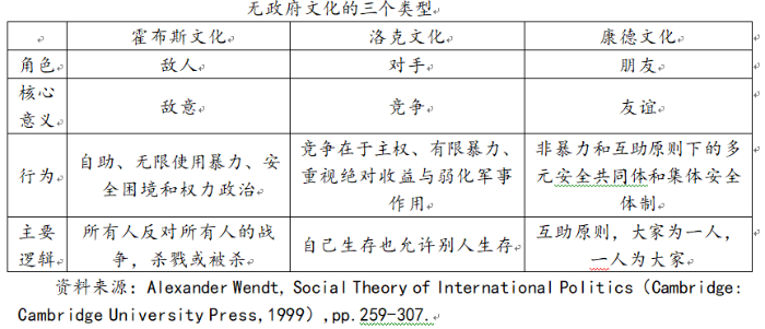 不管是“敌人文化”、“对手文化”还是“朋友文化”,都是在国与国互动中由其他国家在认知的基础上所形成的。换言之,一国的国家形象是由该国与他国之间建构的“无政府文化”类型所决定的。霍布斯文化塑造的是“敌人形象”,洛克文化塑造的是“竞争者(对手)形象”,而康德文化塑造的则是“朋友形象”。(三种“无政府文化”类型,见下表)