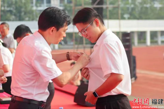 开学典礼上还举行校徽佩戴仪式,校领导为两个校区的新生代表佩戴校徽,并为恰逢在典礼当天过生日的新生送上礼包。