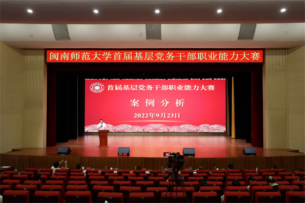 本次比赛共19支代表队参赛,参赛对象为学校基层党务干部。比赛内容包含党务知识测试、微党课展示、案例分析、谈心谈话四个环节。党务知识测试由所有参赛选手参加,微党课展示、案例分析、谈心谈话等实践环节由各参赛队分别选派队员参加。实践环节的比赛在闽南文化艺术中心举行。比赛在红色歌舞《灯火里的中国》中拉开帷幕,各参赛选手结合自身工作实际,用生动而又富有教育意义的微党课、专业而又充满启迪效果的案例分析、严肃而又不失温情的谈心谈话,展现了新时代党务干部不负韶华、开拓创新的精神风貌与责任担当。