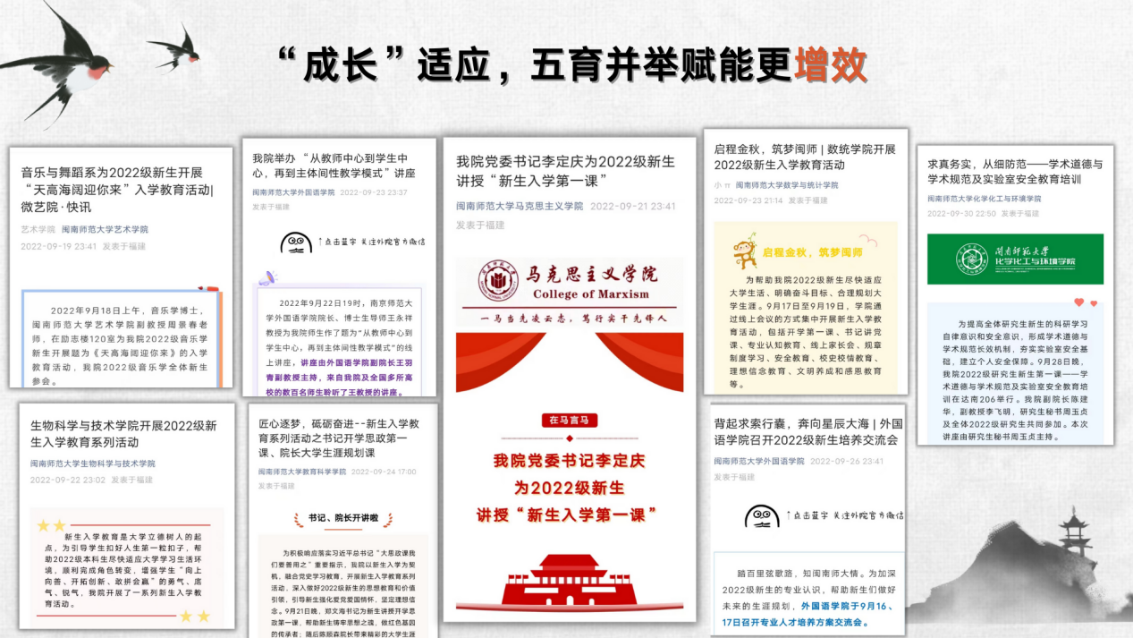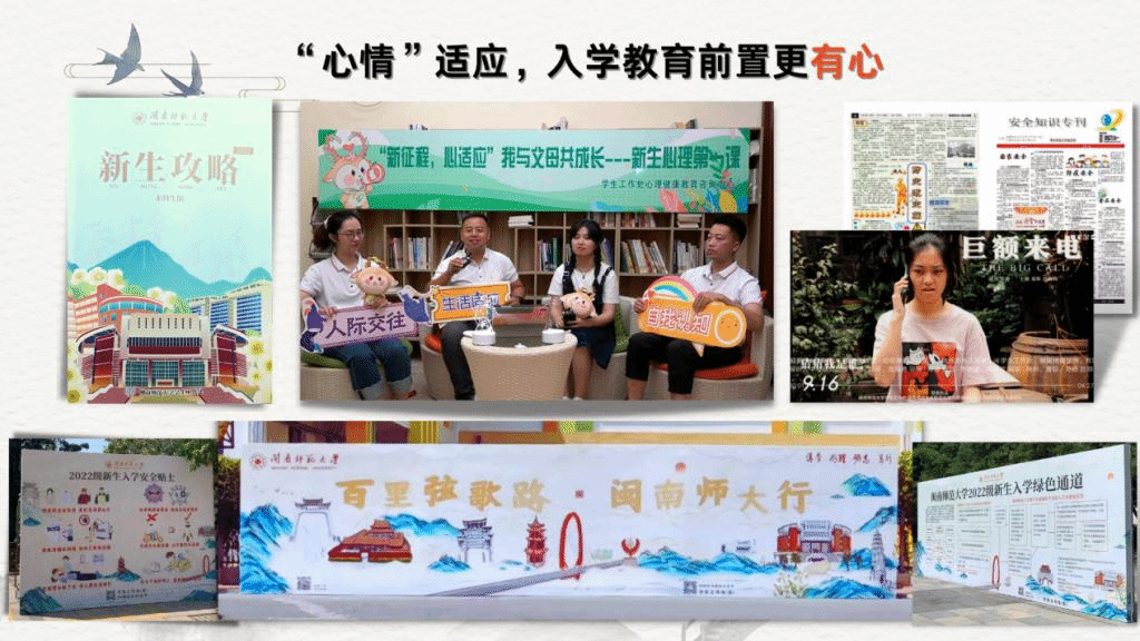 学校把规章制度、安全管理、资助政策、心理健康等入学教育前置,编制《新生攻略》与录取通知书一同寄达学生手中。通过在新生入学前组织“入学常识测试”、召开线上班会、推出系列主题教育推文等,上好新生入学教育课。开展“新征程,心适应”我与父母共同成长新生心理健康教育直播,新生与家长积极参与线上互动,有近10万次点赞。新生报到期间,学校推出《巨额来电》《少年正启航》《从“新”开始》等入学教育系列宣传片,组织开展安全大排查,通过《安全专刊》、安全提示展板、公寓安全教育专栏、反诈宣传点等,全面加强疫情防控、消防安全、防范诈骗、出行安全等教育工作,确保新生安全启航。