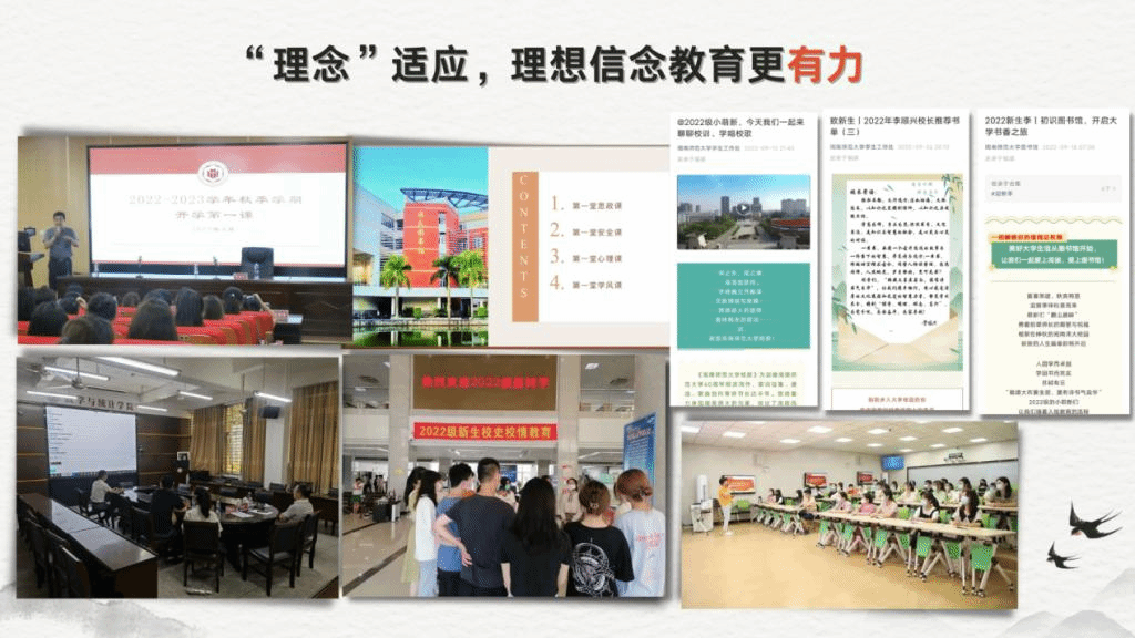 学校针对本科生、研究生不同群体特点分别制定教育方案,集中开展以“第一堂思政课”“第一堂安全课”“第一堂心理课”“第一堂学风课”为内容的教育课程,激励新生要笃定奋斗目标跟党走,将青春汇入时代洪流。以校情校史教育为切入点,组织新生参观VR校史馆、图书馆,开展学唱校歌、学习校训、佩戴校徽活动,召开榜样引领专题座谈会、宣讲会等,让学生深切感受博学、明理、砺志、笃行的校园文化精神。