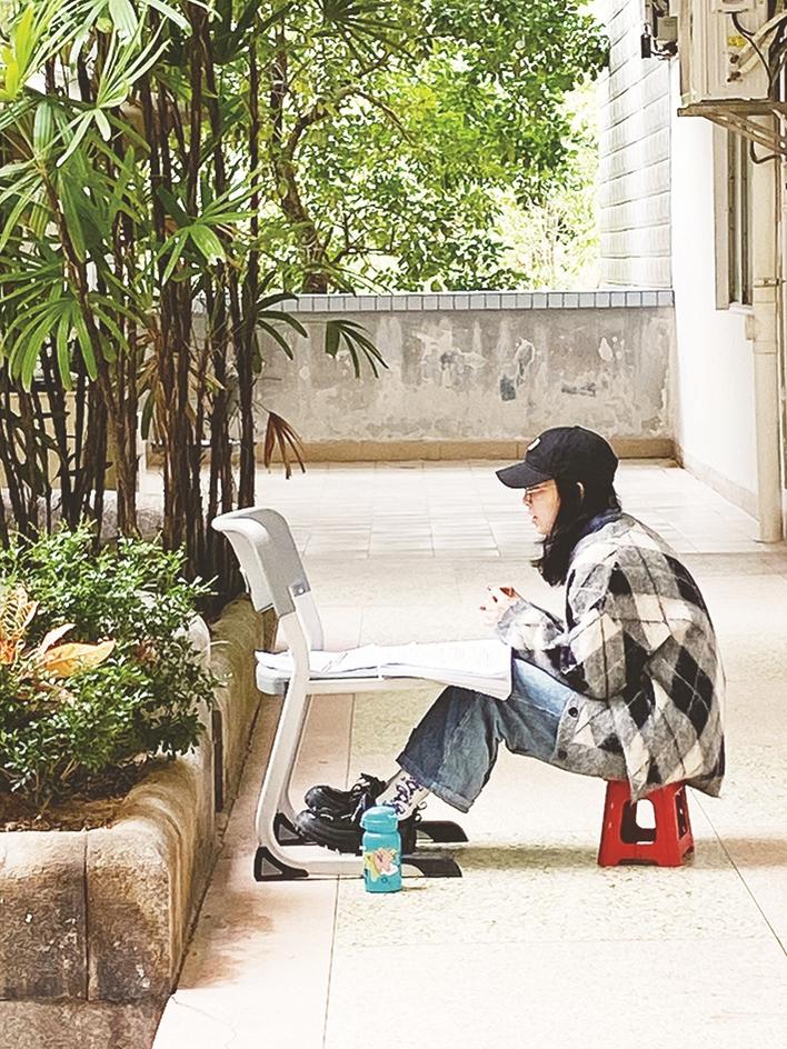 埋头书海时,陈奕佳同学接到了家人的电话,电话那头是妈妈的嘘寒问暖,亲切的乡音对她而言无疑是莫大的鼓励。关于考研,陈奕佳的最大感受是孤独。身边要好的朋友大多已步入职场,相比他们丰富多彩的生活,陈奕佳独自穿梭在宿舍、食堂和图书馆,三点一线、日复一日的考研生活显得有些枯燥无味。