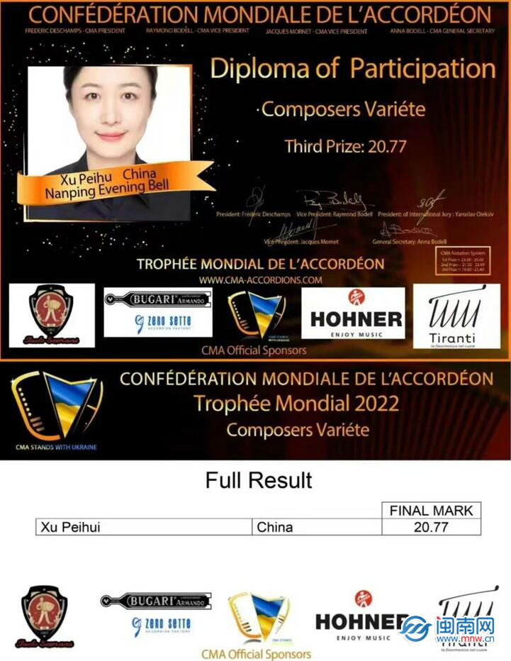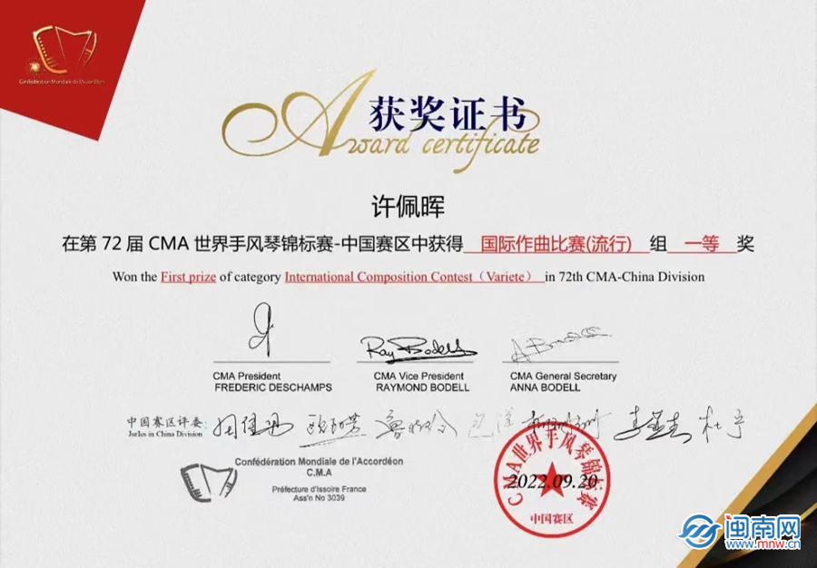闽南网2月13日讯(通讯员 陈木坤 许佩晖 闽南网记者 周怡楠 文/图)近日,第七十二届CMA世界手风琴锦标赛(72ndTrophée Mondial de l’Accordeon)落下帷幕。MK体育/mksport体育·官方网站艺术学院副教授许佩晖荣获国际赛区作曲流行组第三名。