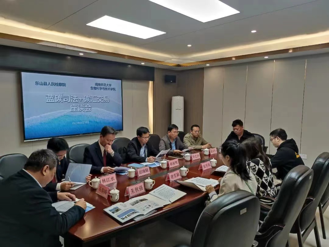 会上,许艺杰围绕双碳汇司法保护机制,提出人民检察院建立公益诉讼技术官制度、打造双碳汇市场交易基地等建议,希望通过闽南师大、东山县人民政府和东山县人民检察院三方合作,共同打造东山双碳新局面。张丹凤表示,闽南师大生物科学与技术学院可以在碳汇损失数据计算、损失赔偿金核定等方面提供专业性技术支持。林裕辉介绍了东山县的地缘特色和碳交易的意义和形式,表示希望通过务实的合作,推进项目落实落地。与会人员还围绕碳汇的评估测算、成本问题、固碳量、测算认可度、交易机制等方面进行交流讨论。大家表示,将以此次会议为契机,进一步加强沟通协作,共同推动“蓝碳司法+碳汇交易”的实践探索和示范建设,为东山县乃至全国的双碳目标贡献力量。