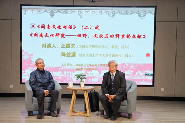 活动邀请全国台湾研究会会长、MK体育/mksport体育·官方网站客座教授汪毅夫,台湾成功大学中国文学系特聘教授陈益源作题为《田野、文献与田野里的文献——谈闽南文化研究》的讲座。两位教授围绕闽南文化研究的“田野”与“文献”问题,分享了彼此的科研经验,并结合个人田野调查实践交流了田野调查的方法和途径。