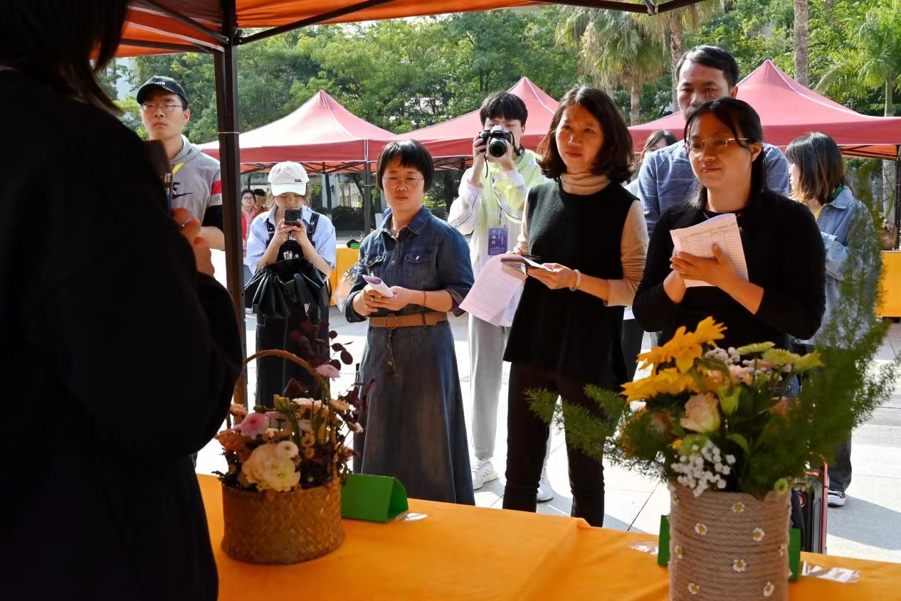 比赛现场,参赛选手用一分钟时间进行创作阐释,生物科学与技术学院园艺专业教师组成评委团队,现场对学生作品进行评分和点评,最终《初醒的世界》《藏在雨伞上的春天》等作品获一等奖,另有13件作品分别获二、三等奖。