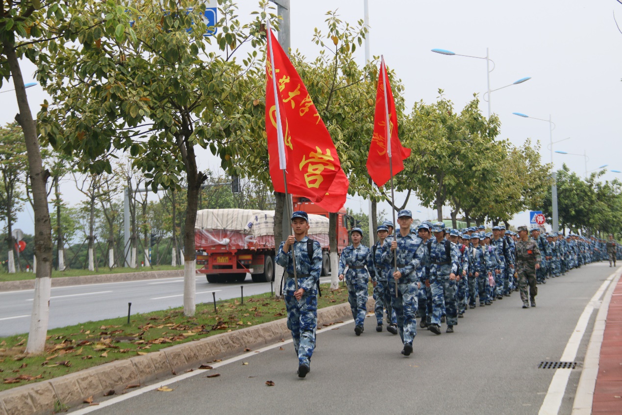 随着吴彬镪书记扣响发令枪,这场同学们期待已久的军训拉练拉开序幕。在队列最前端,圆山营和各连队的旗帜迎风飘扬,蓝色的迷彩组成一条长龙,跨校门、经大道、穿田野、奔圆山,在苍翠的树木之间腾挪律动。