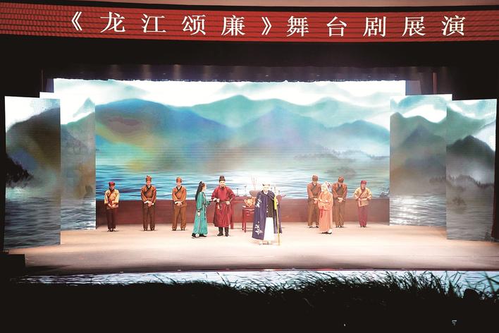 舞台剧《龙江颂廉》由陈元光开漳、蔡新立家训、谷文昌护树三个故事串联而成。其中,第一幕《元光开漳》讲述了陈元光平定蛮獠啸乱后带领族人驻守闽南、开发漳州的故事,展现了陈元光家族“舍小家为国家”的精神;第二幕《蔡新立训》讲述了蔡世远与蔡新“叔侄两帝师”为官清廉正直,维护良好家风,突出了蔡氏一族“严义利之辨”的传承;第三幕《谷公护木》讲述了“大跃进”时期,谷文昌顶住压力,保住东山岛来之不易的木麻黄,并带领人民修建八尺门海堤的故事,彰显了共产党员“实事求是、一切为了人民”的高风亮节。
