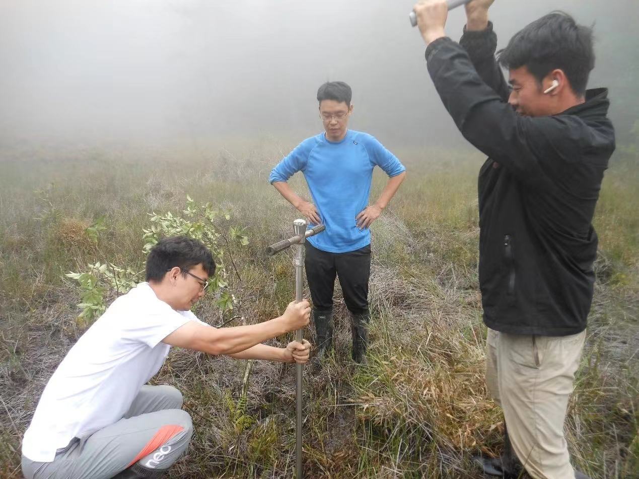本研究始于2020年11月,当时研究团队三位老师带领地理科学专业学生在梅花山野外实习过程中意外收获一铲黑色泥炭,而泥炭是地学古环境研究理想的研究对象。2021年11月,潘大东老师组织师生团队进一步对梅花山开展野外科研调查,继续寻找更具科研价值的沼泽泥炭地。梅花山自然保护区山路崎岖,考察条件艰苦,汽车难以到达,且无通讯信号,经过艰苦的探寻,团队终于在第三天找到较为理想的泥炭地。