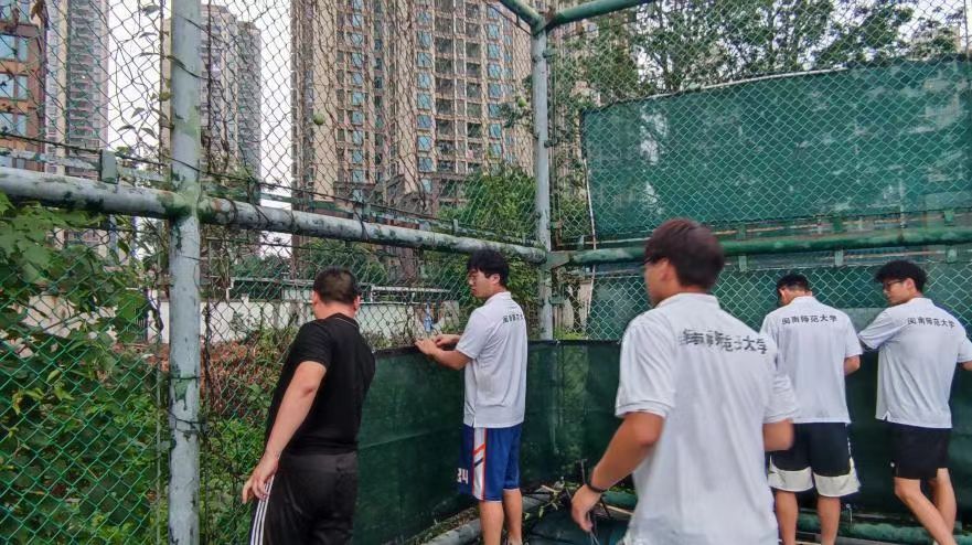 活动现场,同学们有序分工,对网球场边缘和球网进行清扫以及维修,大家拿着准备好的工具,认真清理墙面上的藤曼、杂草,用扫帚清扫球场内的落叶、垃圾,用针线缝补加固球网,对卫生死角进行逐一排查。