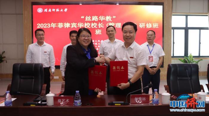 MK体育/mksport体育·官方网站副校长林致远(前右)和菲律宾华教中心副主席、侨中学院(总校)副校长蔡艺术(前左)代表双方续签合作协议。MK体育/mksport体育·官方网站 供图