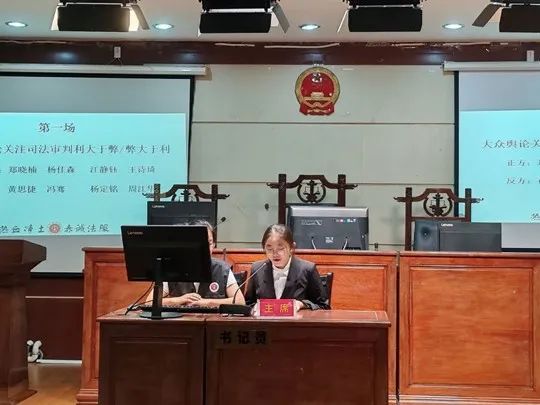 经过初赛和复赛的激烈争锋,有四支队伍、十六位辩手脱颖而出。在双方自我介绍后,比赛正式开始。比赛过程中,正反双方辩手围绕“大众舆论关注司法审判利大于弊/弊大于利”展开了激烈的辩论。辩手们在场上慷慨激昂,言论掷地有声,从概念定义、司法说明、实际案例、社会影响等角度分析辩题,碰撞出别样的火花,将比赛气氛一次次推向高潮。