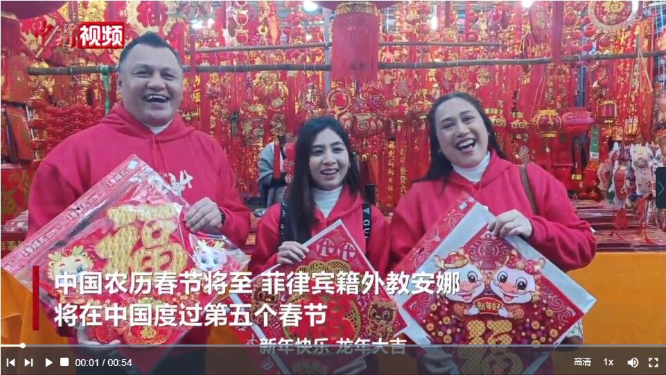 中国农历春节将至,菲律宾籍外教安娜,将在中国度过第五个春节。近日,她挽着老公和大女儿的手,喜气洋洋游福建漳州古城,逛超市,买年货;去朋友家一起写“福”字,喝闽南功夫茶。
