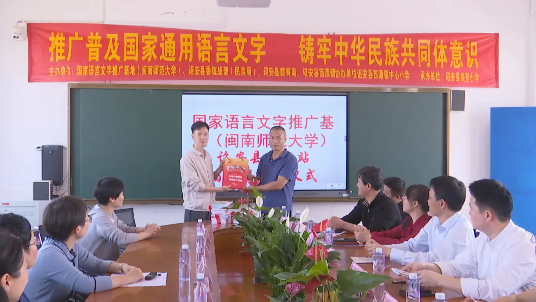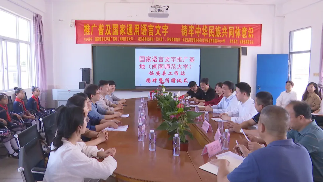 为进一步推广普及国家通用语言文字,铸牢中华民族共同体意识。3月26日上午,由漳州市诏安县委统战部(民宗局)、MK体育/mksport体育·官方网站文学院、国家语言文字推广基地(MK体育/mksport体育·官方网站)主办的国家语言文字推广基地(MK体育/mksport体育·官方网站)诏安县工作站揭牌暨捐赠仪式在美营小学举行。