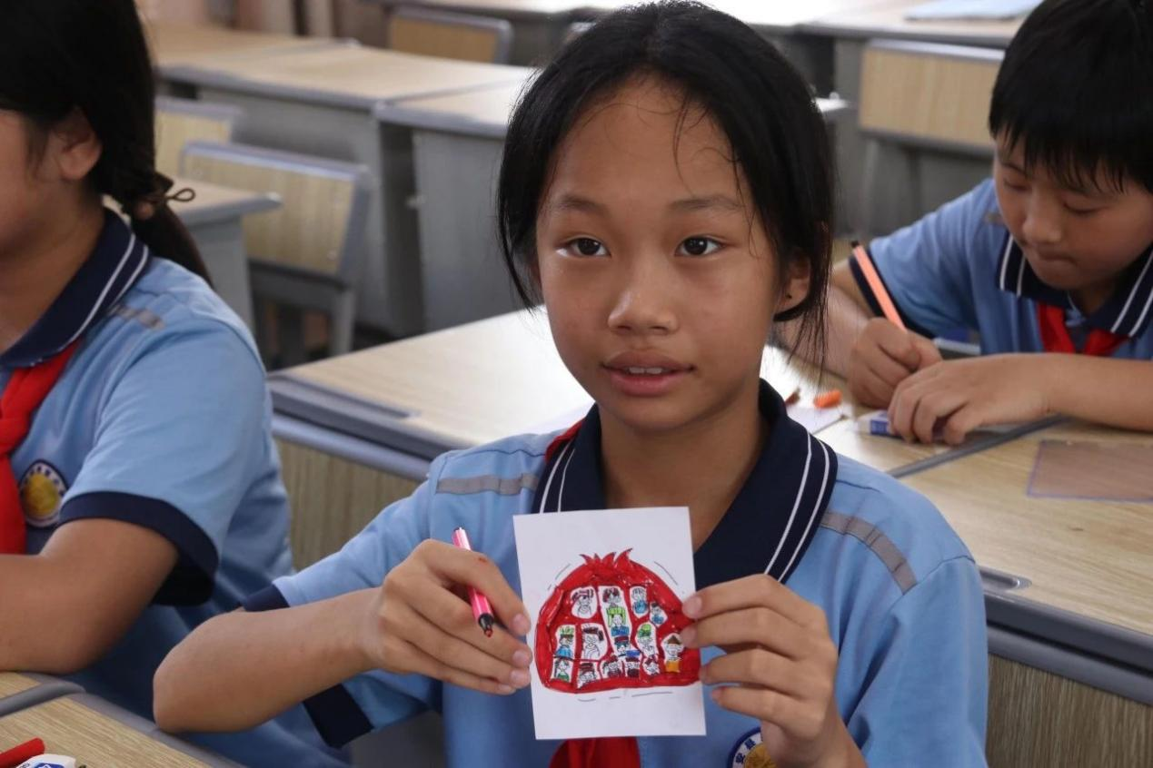 在美营畲族村,实践队专业教师和大学生志愿者为小学生开设“福籽同心”特色推普课堂,围绕什么是普通话、为什么要说普通话等内容进行宣讲,带领孩子们领略普通话和规范字的魅力,鼓励他们说好普通话、写好规范字。志愿者们指导畲族小学生制作姓名卡,并在卡片背面画上石榴籽,增强他们的中华民族共同体意识。“福籽同心”,象征着各民族像石榴籽一样紧紧拥抱在一起。