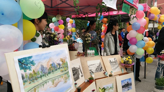 3月26日下午闽南师大弦歌广场被33个简易帐篷和络绎不绝的游园者占据,不远处就能闻到糕点和茶的香味。帐篷由师大生科院各个班级搭建而成,每个帐篷里面都摆满以班级为单位制作的点心,水果,画作,插花等食品和小物品,路上的行人不时驻足游览。