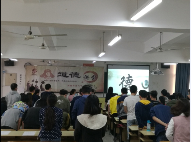 这是计算机学院道德讲堂的活动现场的诵经典环节。活动以“诚以修身,信以养德”为主题,开展了静默省心,唱一首歌曲,诵一段经典,作一个承诺,向德鞠躬,送一份吉祥,一部短片,作一番点评,一堂一善事等九个环节。同学们结合时事热点,自拍自导自演了一系列情景剧,高度还原了校园中存在的一些不文明的现象并加以指正,让同学们更加深刻的体会到“诚信”的重要性。在“一堂一善事”环节中,我院在全校范围内为患病的陈欣同学开展了募捐活动,广大热心的老师和同学献出了爱心和对陈欣同学最真诚的祝福。最后,在热烈的掌声中,计算机学院第九期道德讲堂活动也圆满落下了帷幕。