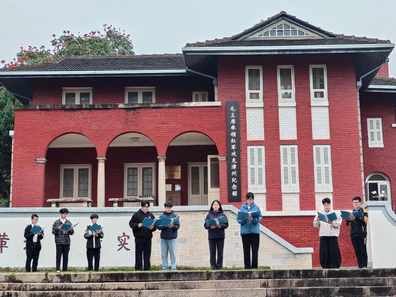剧社师生来到芝山红楼,李林研究专家、漳州高新区古县中学教师郑坤全为党员们开展李林事迹专题党课,讲解李林烈士的生平经历和英勇事迹。“我下定决心,投身革命,要成为像列宁一样的人,哪怕粉碎自己,也要为劳苦大众点亮生存的希望。”党支部师生们在芝山红楼前开展《华侨抗日女英雄李林》剧本围读活动。