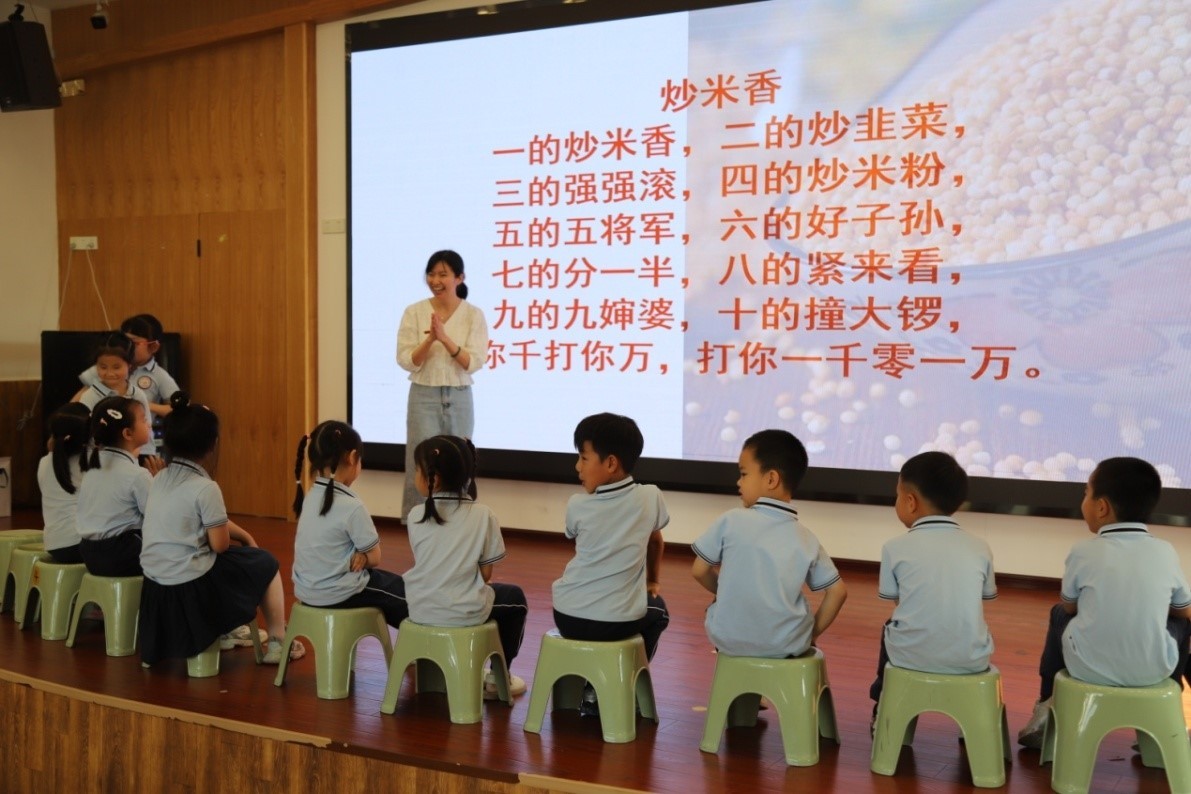 随后,闽南文化研究院青年教师许霖博士为幼儿园小朋友们进行闽南语及闽南童谣现场教学,教他们学说闽南话,唱《炒米香》《天黑黑》等闽南童谣。