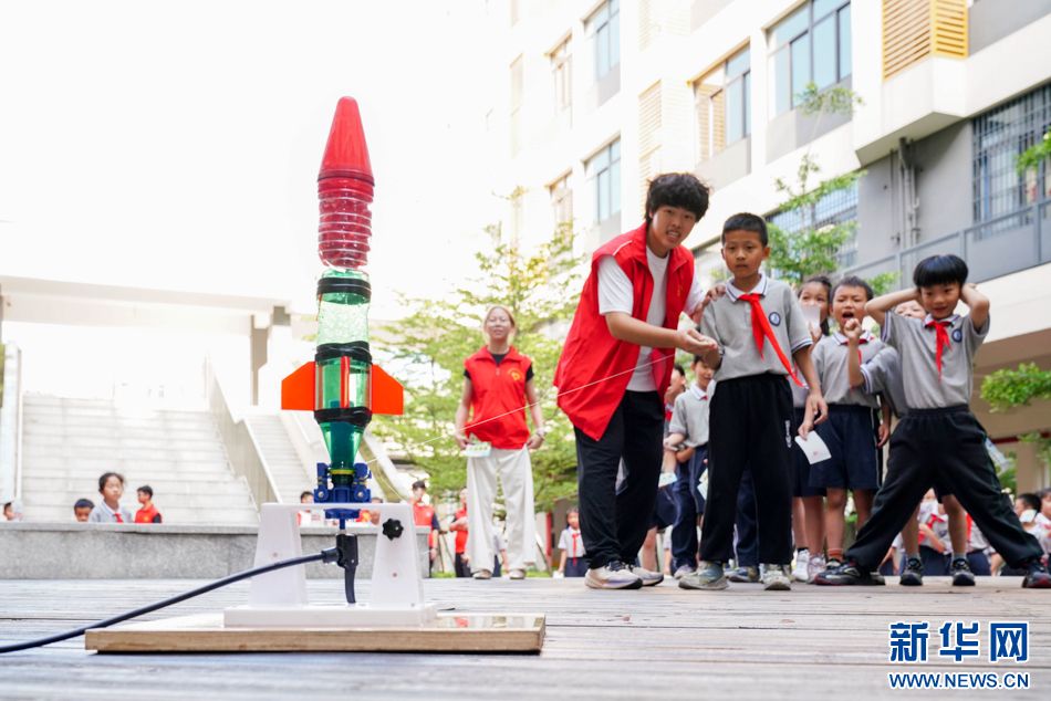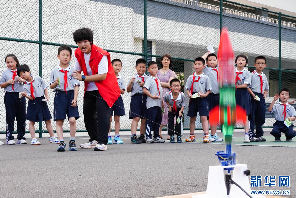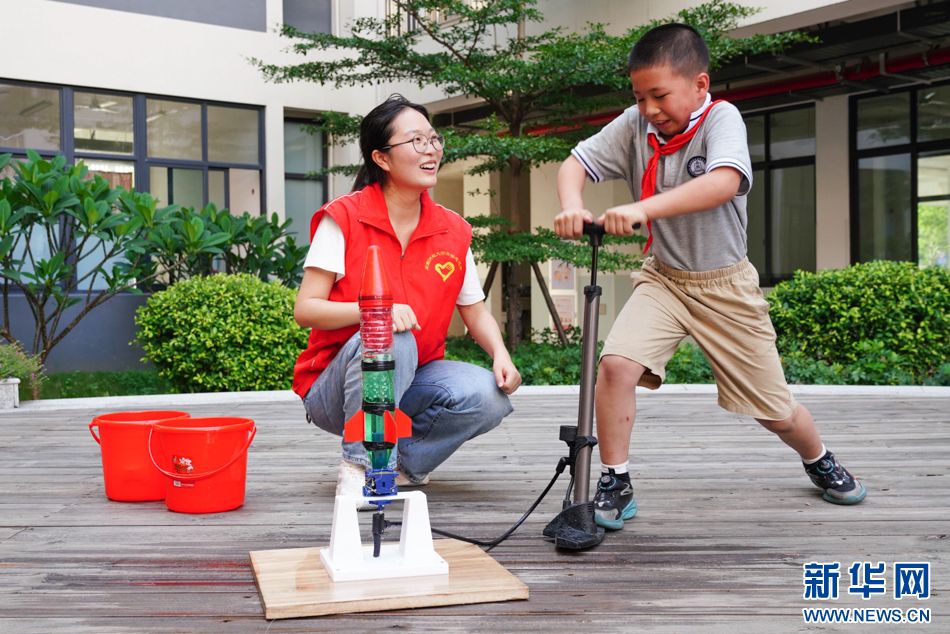 6月5日,学生在志愿者的指导下按压气泵,为水火箭发射做准备。