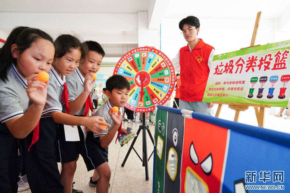 6月5日,学生在参加垃圾分类投篮活动。新华网 肖和勇 摄