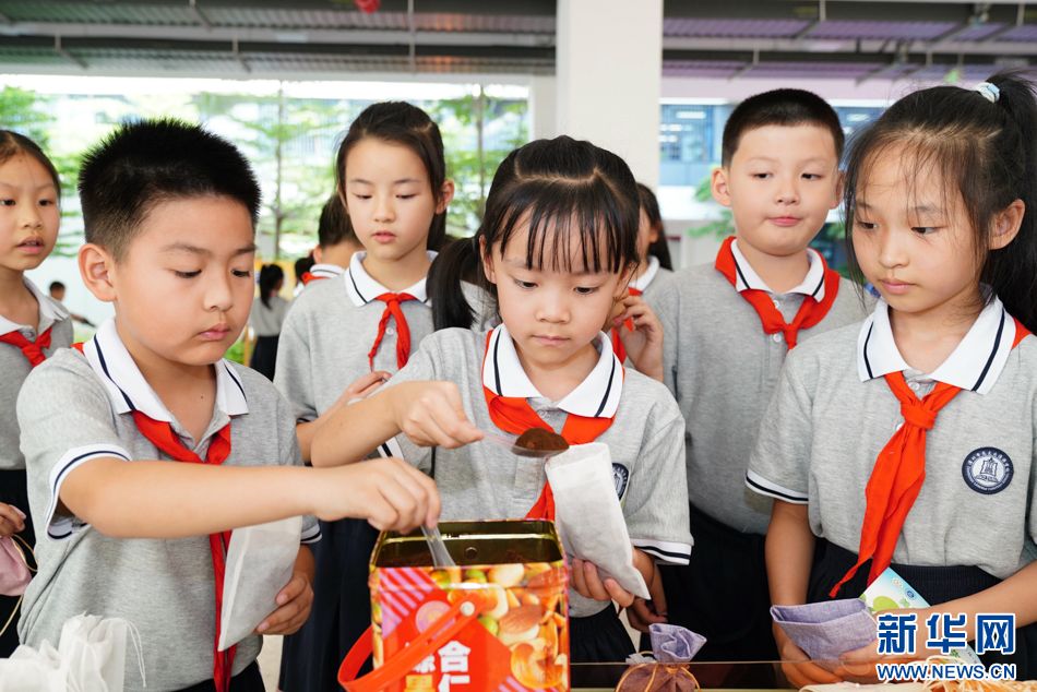 6月5日,学生将咖啡渣装入袋中,准备制作香囊。