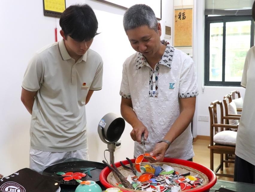 福建省漳州市诏安县沈氏艺圃,剪瓷雕省级非遗传承人沈振南与闽南师大历史地理学院”剪瓷雕韵,筑梦承遗“社会实践队队员分享剪瓷雕的制作流程。杨梓莹 摄