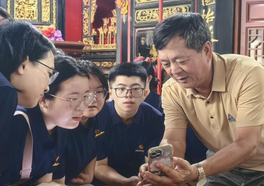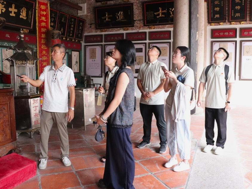 福建省漳州市诏安沈氏大宗祠,省级剪瓷雕工艺(诏安)第五代传承人沈锡仁为实践队队员讲解宗祠内部的建筑结构。 杨思妍 摄