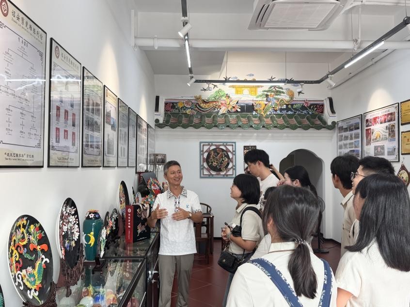福建省漳州市诏安剪瓷雕陈列馆,省级剪瓷雕工艺(诏安)第五代传承人沈锡仁向实践队师生介绍剪瓷雕的制作理念。 张晓婷 摄
