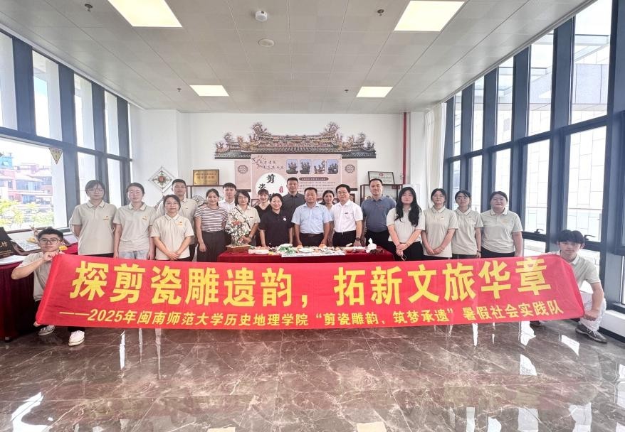 福建省漳州市诏安文化艺术中心非遗展馆(剪瓷雕馆),闽南师大校党委副书记林致远、廖志丹一行和实践队全体师生在展馆内合影留念。 张晓婷 摄