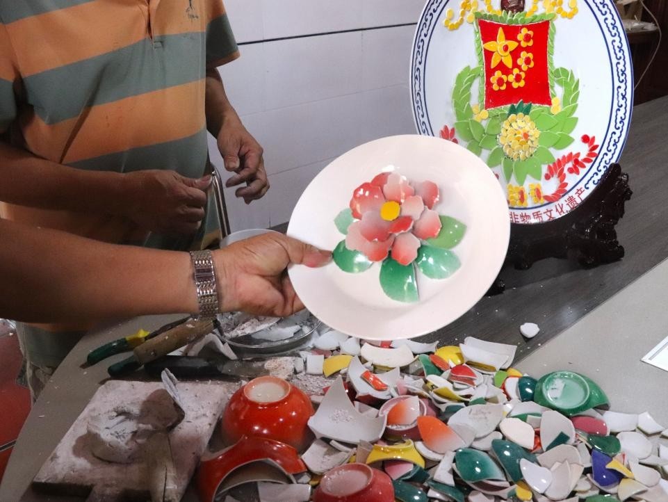 福建省漳州市诏安县沈氏艺圃,剪瓷雕工艺省级非遗传承人沈振泽与沈振南现场制作牡丹剪瓷雕作品。张晓婷 摄