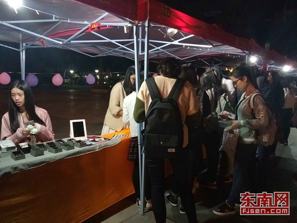 东南网11月15日讯(本网校通社大学生记者 陈舒怡 梁小燕)“这是我们自己做的手工小饰品,价格实惠”“扫一扫二维码就可以免费试吃哦”……11日晚,闽南师大弦歌广场霓虹蔓绕,流光溢彩,环绕在弦歌广场的帐篷组成了一道靓丽的风景线,不少商家、大学生创业者在广场上设点销售。原来,闽南师大一年一度的造梦灯光夜市正繁荣开市。