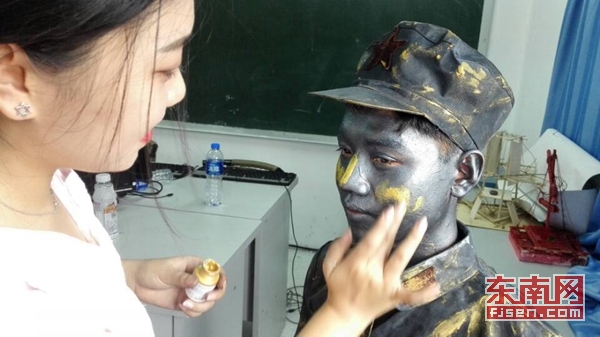 新生樊鸿兴奋地说,以前在网络上看过这种表演方式,没有想到来学校的第一天能目睹这一表演。“一开始还以为是真的铜人,后来他们突然挥舞大旗才知道是表演,演的很投入,很有意义。”