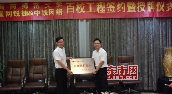 会谈期间,双方就深度产教融合、校企协同培育IT人才合作模式达成广泛共识。在校企双方领导见证下,闽南师大与锐捷网络股份有限公司、中锐网络股份有限公司正式签署百校IT人才发展计划项目协议,李顺兴副校长与中锐网络总经理黄祖海先生互授合作牌匾。