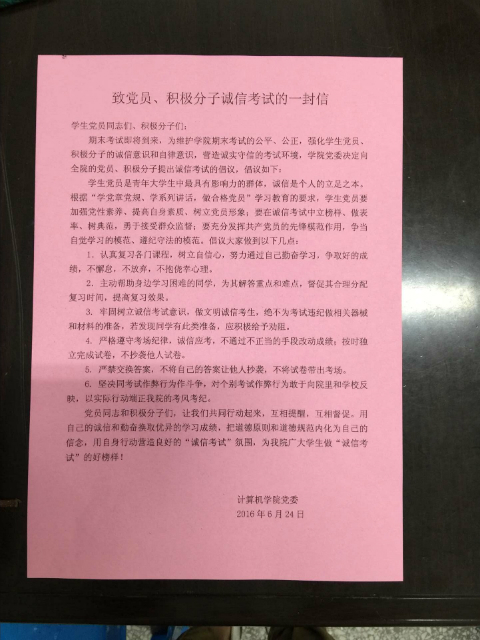 6月25日,计算机学院为全院的党员、积极分子发放了一封诚信考试的倡议书。倡议书号召全体学生党员、积极分子,积极发挥模范带头作用,严格做到六点要求:认真复习、积极备考,不懈怠,不放弃;积极主动,帮助身边学习困难的同学,提高复习效果;树立诚信意识,劝阻不诚信考试行为的苗头;严守考试纪律,独立完成试卷;不抄袭,不将自己的答案让他人抄袭;主动检举考试舞弊行为,维护考试公平。