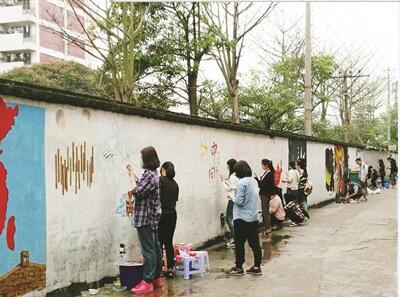 近日来,闽南师大学生在瑞京社区辖区内的空白围墙上作画,主题为“共绘中国梦”。经过多日的描绘,在百米长的围墙上,已经呈现出了多幅缤纷多彩的画作,为沿途的街道增添了一道亮丽的风景。