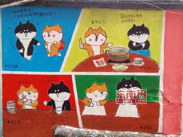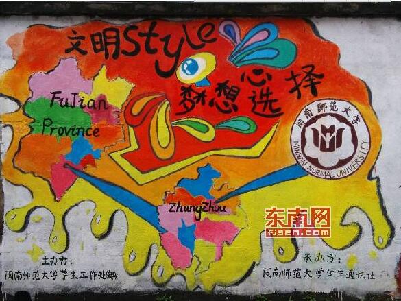 闽南师大郑旭同学表示,瑞京小巷原本是一面有些陈旧的墙,他们为了让这面墙充满艺术魅力。他们以墙面当“画板”,以“文明style.梦想‘心’选择”为主题,发起了涂鸦创作活动。不少选手在作品里融入了“中国梦”、“反腐”等元素,特别有意思的还有同学以学校校规为内容进行创作。