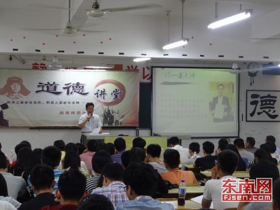 活动开始,主持人引导大家静默3分钟,反省内心,净化心灵。随后,全场齐唱了《公民道德歌》。“看短片”环节以全国第四届道德模范提名奖获得者赖水顺作为典型;“学模范”环节,赖水顺现身说法,以自己的亲身经历,为广大师生作了题为《怎样成为一个对社会有用的人》的讲座。