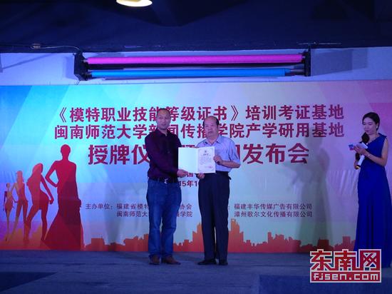 在仪式上,中国模特文化产业联盟名誉主席、福建省模特文化产业协会会长何国鑫为福建丰华传媒广告有限公司张继忠董事长颁发福建丰华传媒广告有限公司福建省《模特职业技能等级证书》培训、考试基地授权书。随后,闽南师大新闻传播学院院长李晓宁教授为张继忠董事长颁发福建丰华传媒广告有限公司MK体育/mksport体育·官方网站新闻传播学院产学研用基地。