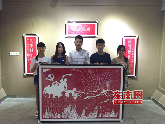 东南网漳州9月8日讯(闽师萱 本网记者 陈惠华) 近日,闽南师大艺术学院的梁昊、黄颖、陈怡宁、戴怡婷和苗壮五名预备党员,历时一个多月的构思、打底和精剪,创作出《保家卫国》组合剪纸作品,以传统剪纸艺术纪念抗日战争胜利70周年,抒发缅怀先烈、励志爱国的心愿。