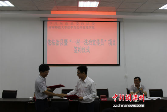 中新漳州网6月12日电(郑容坤 陈小环)6月12日上午,东山县委政法委与法学与公共管理学院共同签署依法治县暨“一村一法治宣传员”项目合作共建纪要,共同推进法治漳州建设。东山县委常委、政法委书记林良海,法学与公共管理学院院长何东平、党委书记汤跃滨,东山县各镇分管综治领导、县公检法司分管领导、县政法委相关领导等参加签约仪式。