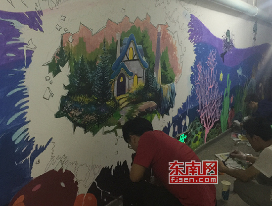 在该校艺术学院四楼琴房的墙面上,原本颜色单调的白墙,成为艺术学院美术系学生的创作海洋,将墙体打扮得“美丽多彩”。沈金兴与组员的作品《蓝色梦幻》以海洋为主题,各种海洋生物跃然于墙,此作品由6个男生完成。据沈同学介绍,《蓝色梦幻》利用抽象的元素,从一个人的嘴巴吐出来一连串海底事物,主要以2D效果体现。“绘画过程中还有一些小插曲,路过琴房的同学会加入我们,帮忙上色。”