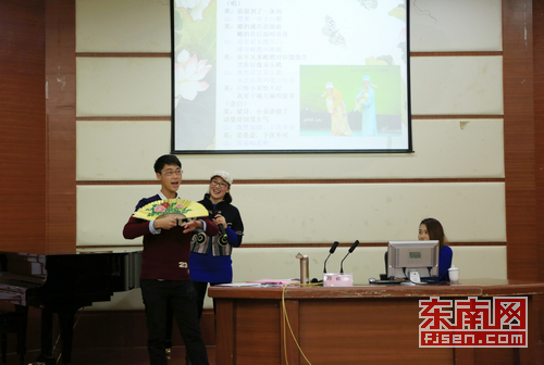 郑娅玲先后作了《浅谈歌仔戏历史、唱腔与表演》、歌仔戏唱腔赏析《梁祝》的主题讲座,她用极其专业且动听的唱腔,从歌仔戏(芗剧)的发展历史、演奏乐器、唱腔分析、身段表演等几个方面,对歌仔戏(芗剧)做了全面的讲解,向在场师生形象地介绍了歌仔戏独特的曲调曲牌及不同行当的表演方式,并现场表演经典的曲牌唱腔和身段动作。