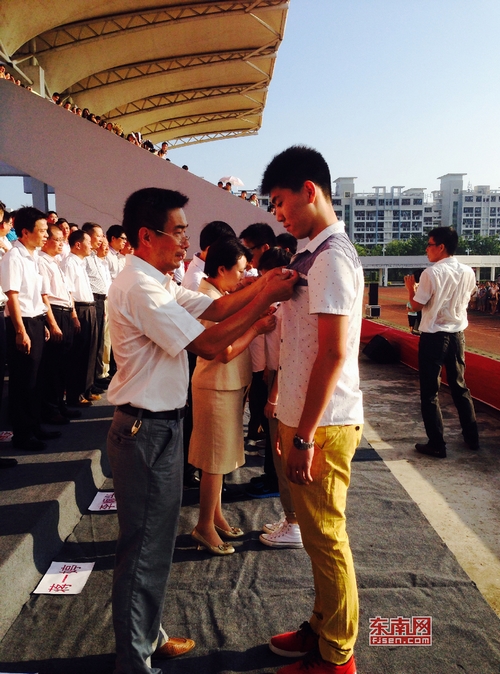 林晓峰书记、吴彬镪副书记等校领导,以及闽南师大校友,漳州市政协副主席李惜真、原漳州师范学院院长康锦堂等为新生代表佩戴校徽,这也标志着5000多名的新生正式成为闽南师大中的一员,将在这里开启新的人生篇章。