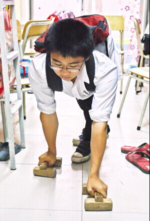 每次用手“行走”之后,罗耀桥一定会先把手擦得干乾净净,再小心翼翼地翻开书本,生怕受伤的污渍弄脏了书本。遇到下雨天,罗耀桥的爬行就变得更艰难,每次他都会变成“落汤鸡”,而怀里的书本却被他保护得完好无损。