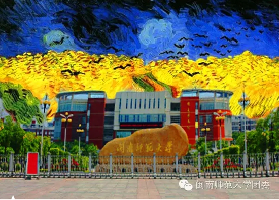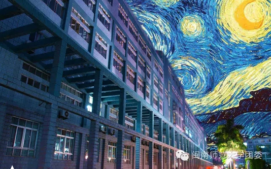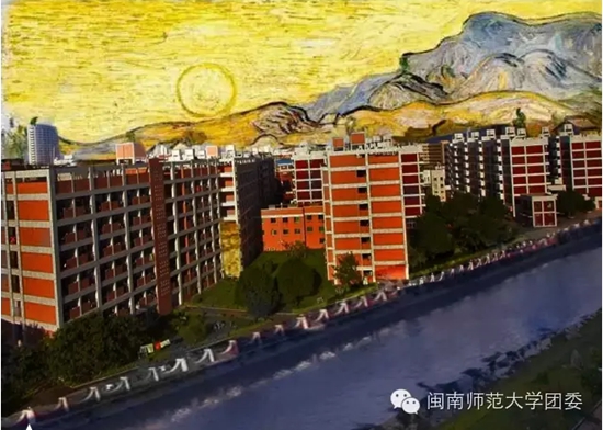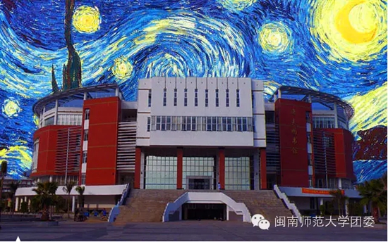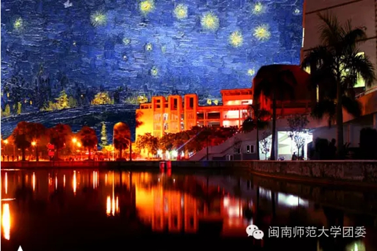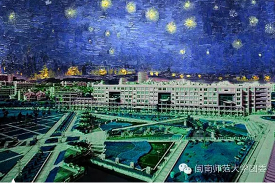 谈及世界名画,就不得不谈及梵高;谈及梵高,就不得不谈及星夜三部曲。星夜三部曲是梵高埋藏在灵魂深处对宇宙、世界的感受。星夜三部曲,有一股扑面而来的气息,感觉到暖风和畅,夜晚的宁静中孕育着勃勃生机,盘旋的云龙说不清是色彩还是情感,说不清是现实还是梦想。当梵高的星空遇上闽南师大,又会发生怎样的梦幻?