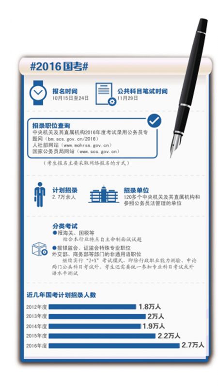 昨天,中组部、人社部和国家公务员局发布消息称,2016年度中央机关及其直属机构考试录用公务员明天起开始报名,公共科目笔试定于11月29日举行。这次招录共有120多个中央机关及其直属机构和参照公务员法管理的单位参加,计划招录2.7万余人,同比扩招约5000人。中公教育和华图教育公考专家则透露,由于近十年来国考招录人数一直未超越2.5万人,这意味着这次的招录人数再次刷新了去年创下的历史最高值。