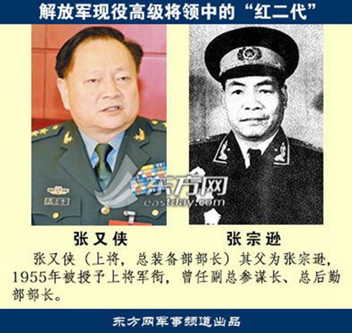 总装备部部长张又侠的父亲是“开国上将”张宗逊,随着张又侠2011年7月晋升上将,成就了中国人民解放军军史上第二对“父子上将”。